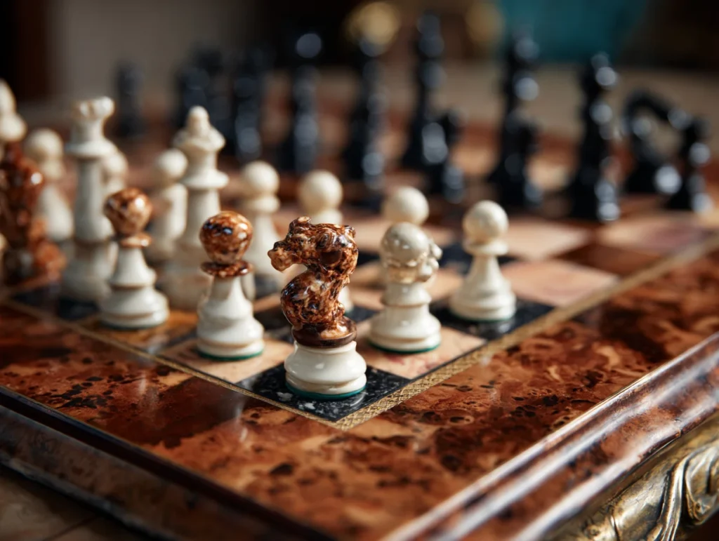 La qualité de nos planches d’échecs est au cœur de notre mission, et nous utilisons uniquement des matériaux soigneusement sélectionnés pour garantir durabilité et esthétique. Nos planches en bois sont fabriquées à partir de différentes essences, notamment le noyer, le chêne et l’érable, choisis pour leur robustesse et leur beauté naturelle. Le bois massif offre non seulement une excellente longévité, mais il apporte également une sensation chaleureuse et traditionnelle au jeu. Pour les planches en plastique, nous utilisons des polymères de haute qualité qui imitent l’apparence du bois tout en étant légers et faciles à transporter. Ces planches sont également idéales pour les enfants et les débutants en raison de leur prix abordable. En outre, nous proposons des planches en bambou, un matériau écologique qui allie légèreté et résistance, tout en étant une option durable. Certains de nos modèles haut de gamme intègrent des finitions en marqueterie ou des inserts en pierre pour un aspect encore plus luxueux. Chaque matériau est choisi non seulement pour son esthétique, mais aussi pour améliorer l’expérience de jeu et résister à l’usure au fil du temps.